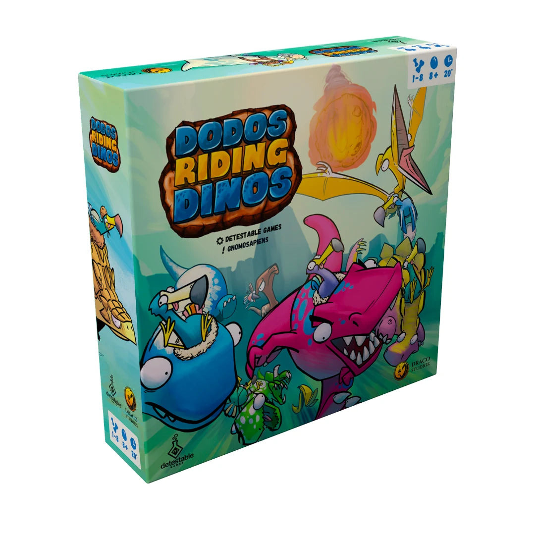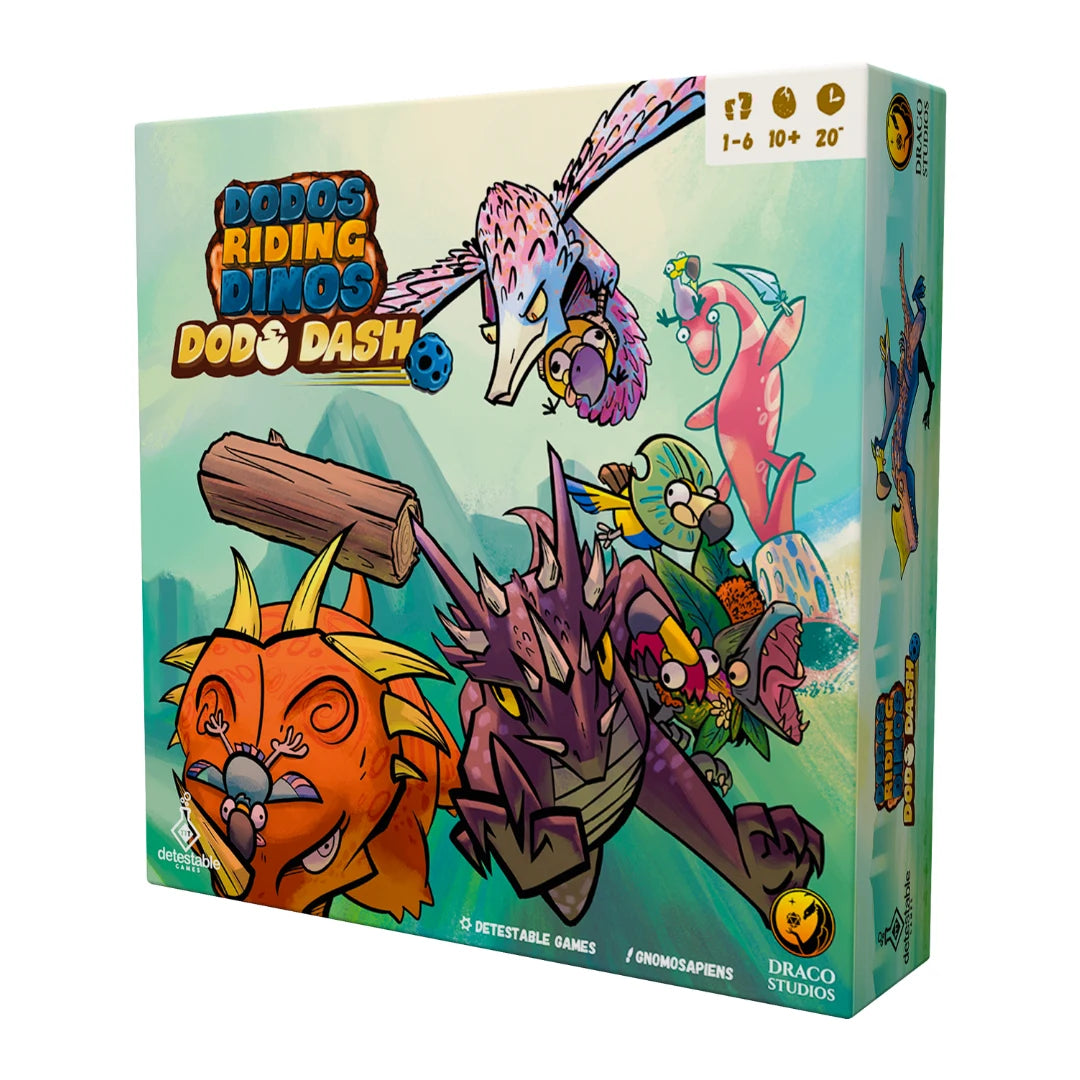 Más velocidad, más caos, más Dodos! Dodo Dash es la expansión independiente que lleva las carreras prehistóricas al siguiente nivel. Nuevos personajes, nuevos proyectiles y un tablero de doble cara con rutas mortales. ¡Juégalo solo o combínalo con el original para una mega-carrera de hasta 8 jugadores!