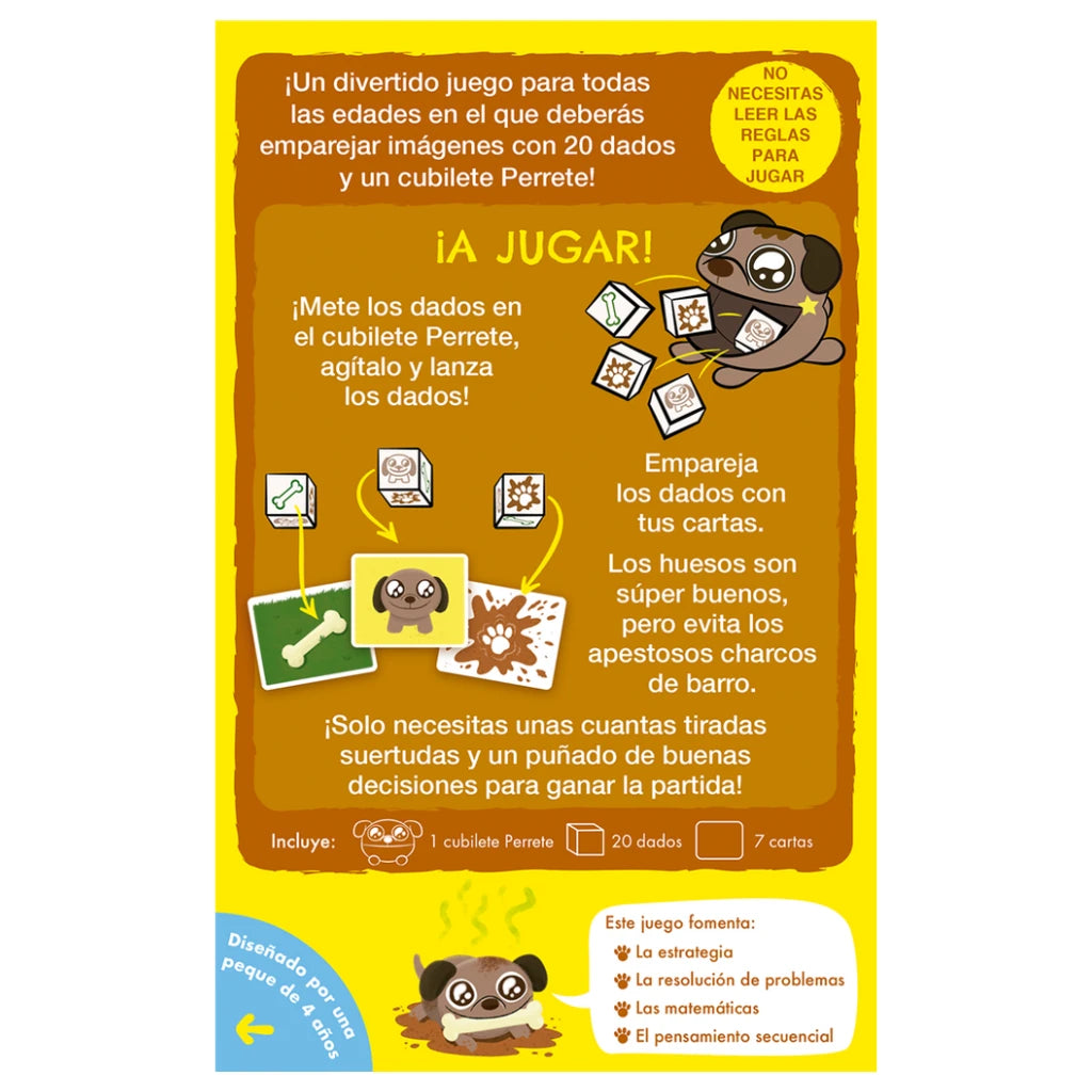 El maloliente juego de emparejar imágenes con 20 dados y un cubilete perrete!¡A jugar! ¡Mete los dados en el cubilete Perrete, agítalo y lanza los dados!Empareja los dados con tus cartas.Los huesos son súper buenos, pero evita los apestosos charcos de barro.¡Solo necesitas unas cuantas tiradas suertudas y un puñado de buenas decisiones para ganar la partida!Lo hemos hecho para ti.Me encantan los juegos, pero ninguno despertaba el interés de mi hija de 4 años. Se distraía, tenía que dejarla ganar siempre y al final no aprendía nada.Entonces, un buen día usamos papel, rotuladores y pegatinas, y decidimos crear juegos que nos gustaran de verdad.Lo que tienes delante es uno de esos juegos. Así que espero que este invento de un diseñador con 25 años de experiencia y una niña de 4 años, que parece saber más que su padre, te guste tanto como a nosotros. —Elan Lee, Creador de Exploding Kittens y AvalonComponentes del juego1 cubilete Perrete, 20 dados y 7 cartas