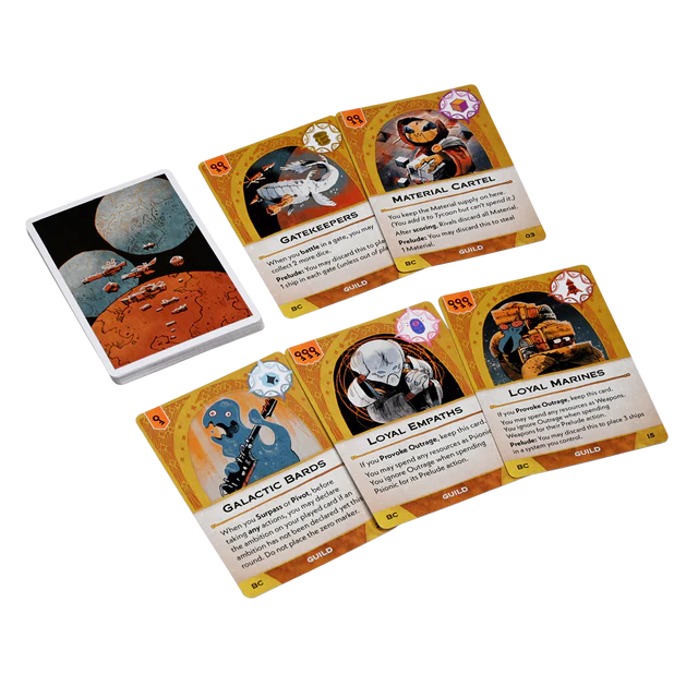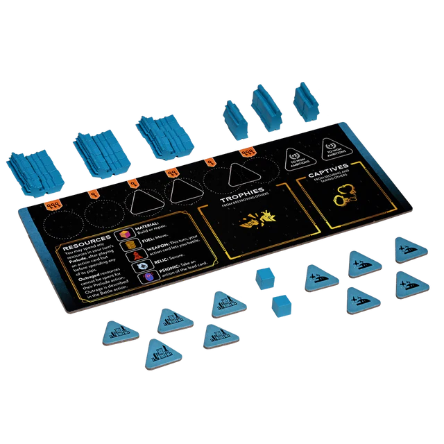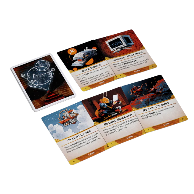 Cada copia incluye más de 100 piezas de madera entre naves y agentes, 18 dados grabados personalizados, un hermoso tablero de seis paneles y decenas de cartas con más de 60 ilustraciones únicas.