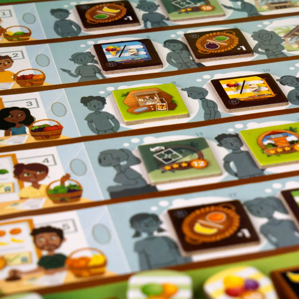 Componentes de Lujo: Incluye fichas de fruta con una textura "gomosa" y detallada que dan ganas de probarlas, elevando la experiencia visual en la mesa.