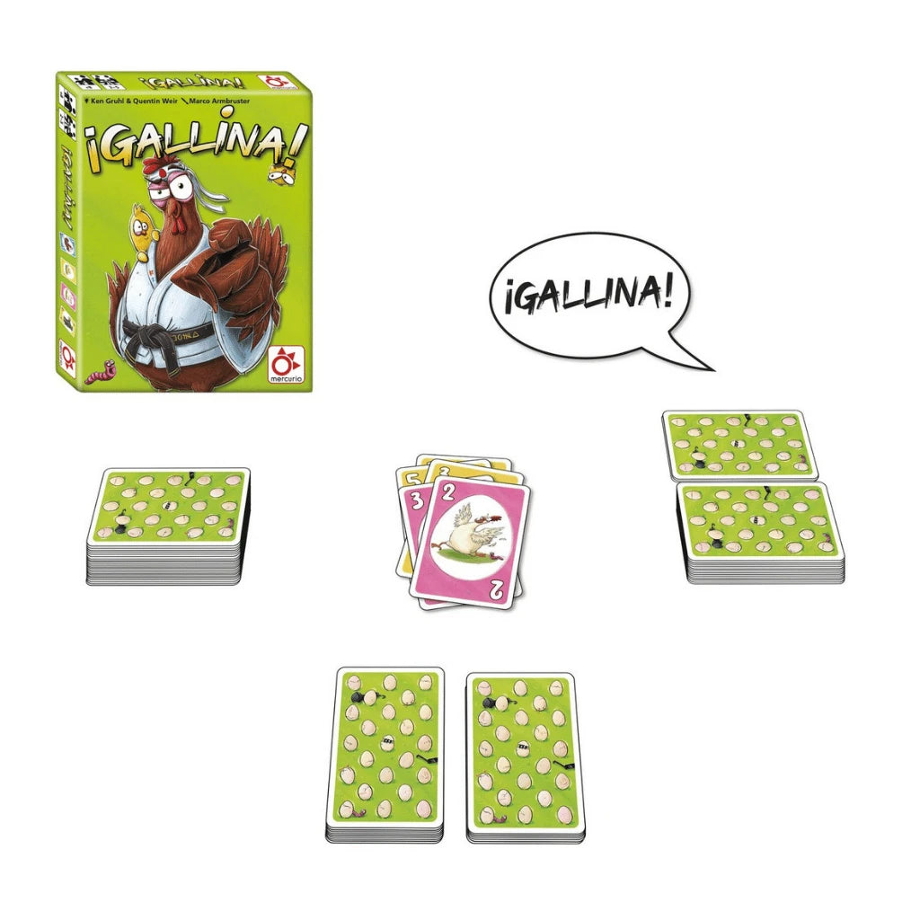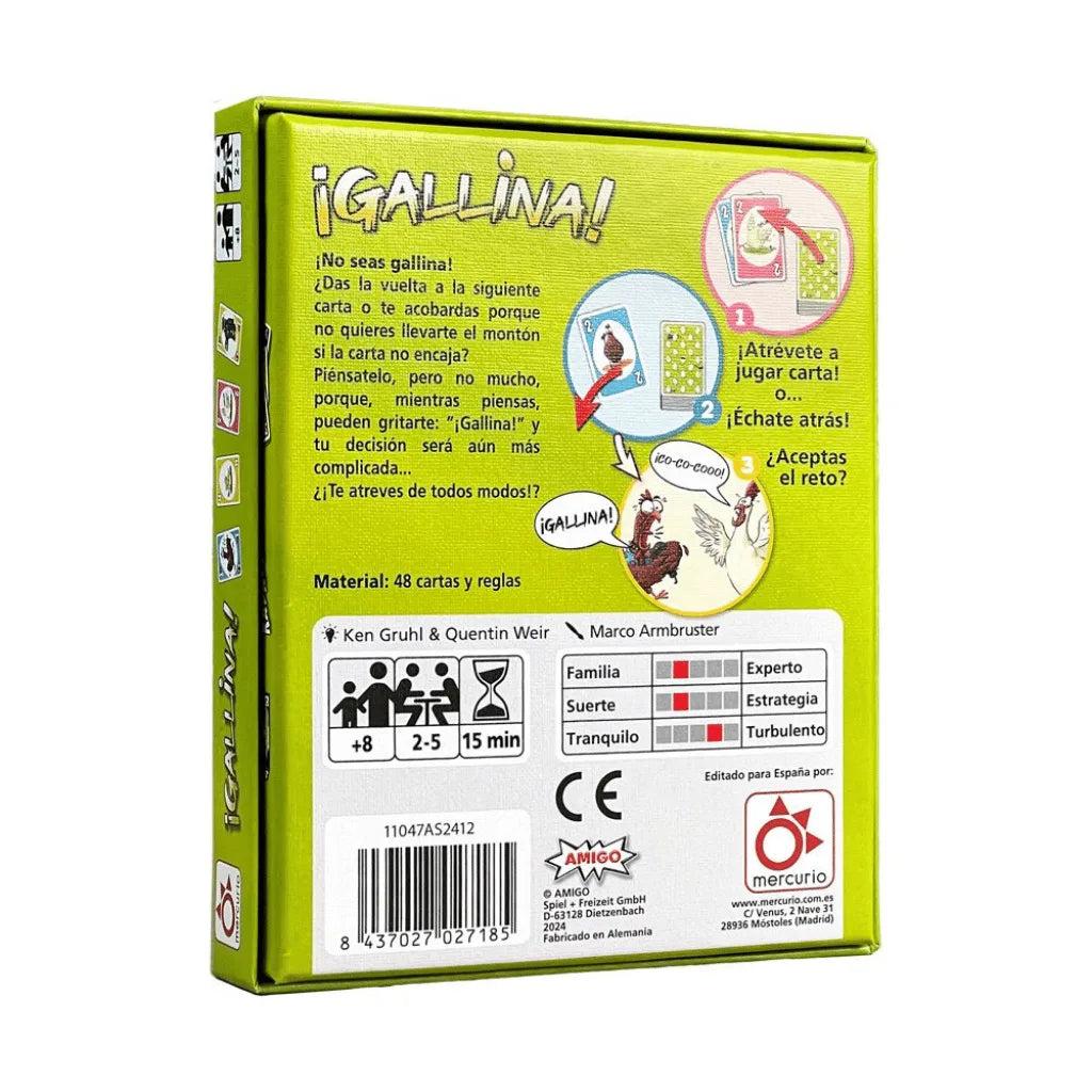 Uno a uno, id girando las cartas de vuestro montón y esperad tener suerte con vuestra carta. ¿Os atrevéréis a girar otra carta, arriesgándoos a llevaros todas las cartas del centro? ¡Serán puntos negativos! ¿O preferiréis jugar sobre seguro y coger la primera carta del montón en su lugar? Eso sí, os arriesgáis a que alguien os grite «¡Gallina!» y la decisión seá aún más difícil…
