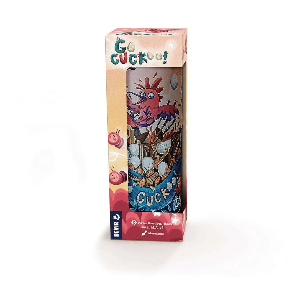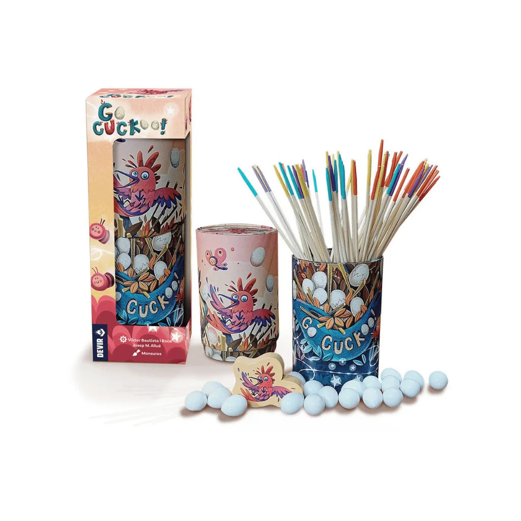 ¡Ayuda al cuco Kuki a construir su nido! En este divertido juego de habilidad, deberéis colocar palos como si fueran ramas para que sostengan los huevos. Pero hacedlo con mucho cuidado, pues cualquier movimiento en falso puede hacer que la estructura se caiga. Ganador del prestigioso As d’Or al mejor juego infantil, Go Cuckoo! es un título ideal para disfrutar en familia.