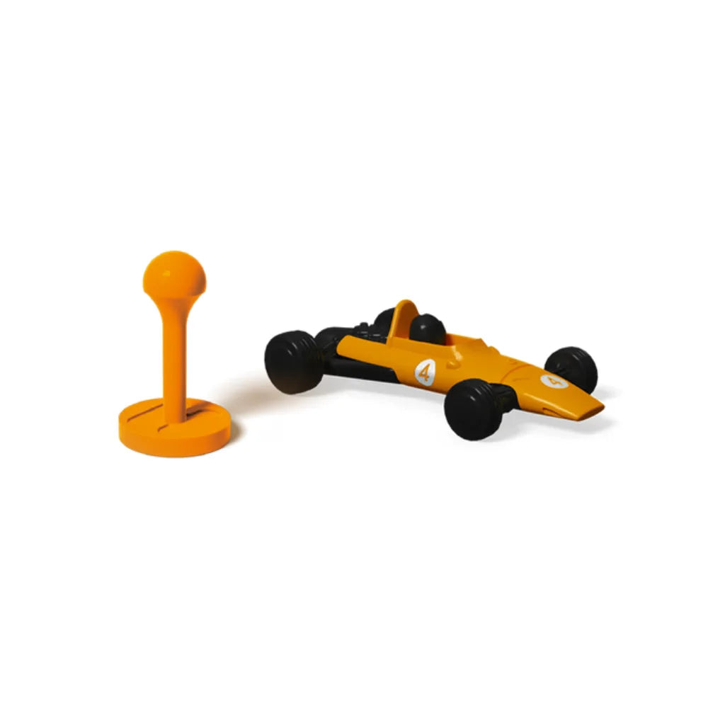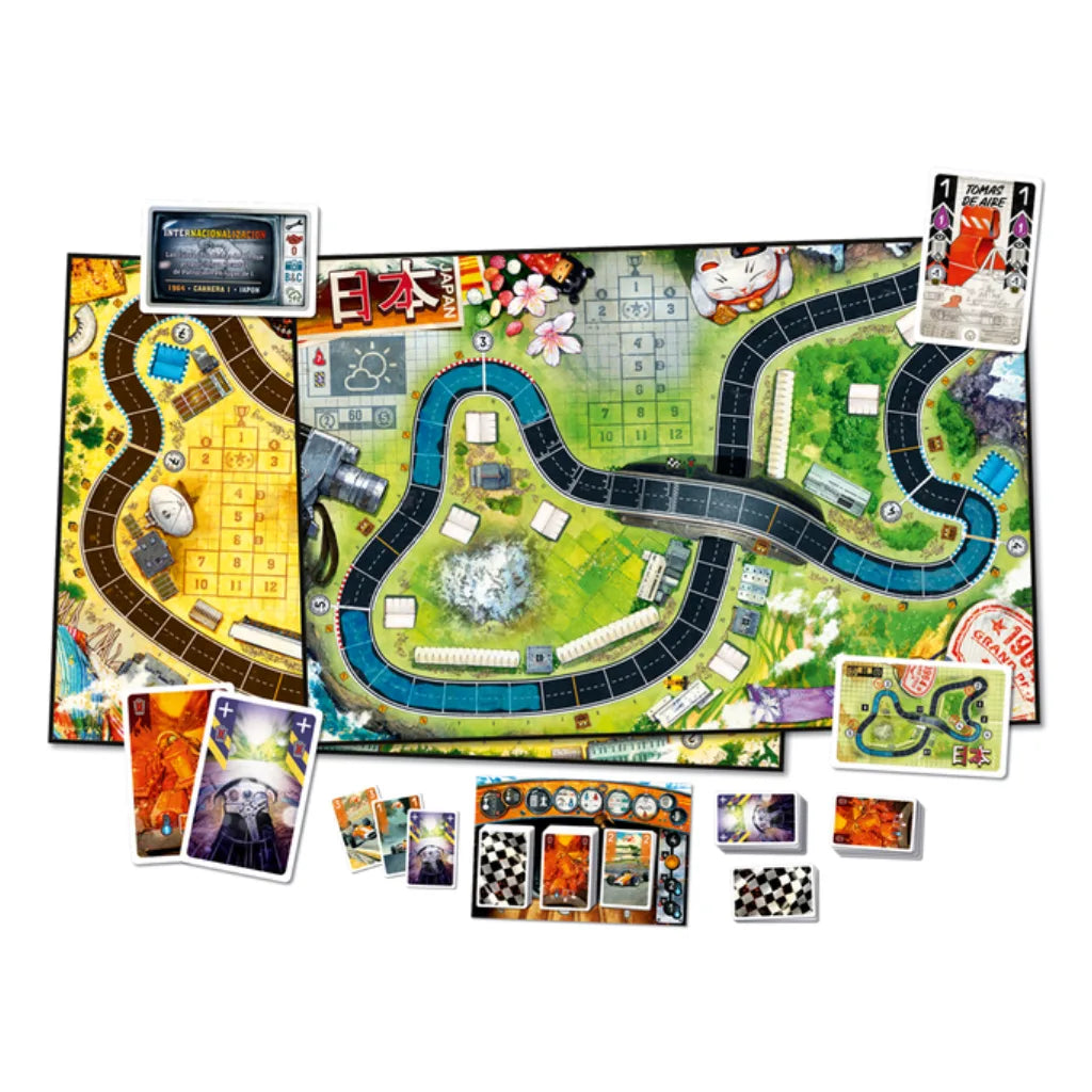 1 enorme tablero de doble cara (2 Circuitos), 2 cartas de Circuito, 1 Coche de carreras con su peón de Caja de cambio correspondiente, 1 tablero de Piloto, 12 cartas de Velocidad, 15 cartas de Motor forzado y 5 cartas de Estrés, 12 cartas de Mejora, 7 cartas de Patrocinio, 4?cartas de Evento, 1 bloc de Campeonato y 1 reglamento.