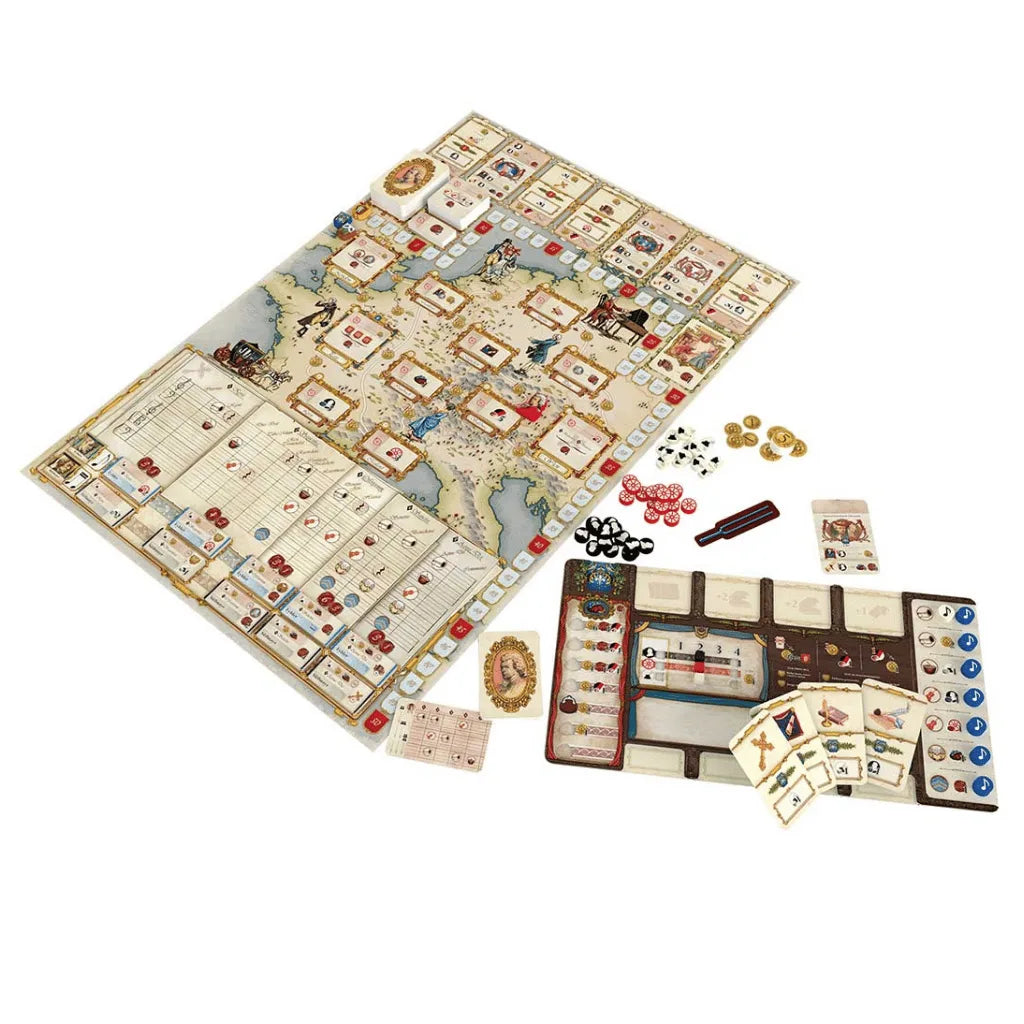 Lacrimosa tiene una puesta en mesa espectacular, con un tablero central repleto de detalles donde se representa un mapa del centro de Europa, a través del cual acompañaréis a Mozart en sus viajes. También se representan los fragmentos del Réquiem, que poco a poco se irá completando con vuestras acciones, y espacios para las cartas de obra y de memorias. Las cartas, que también se juegan en el tablero personal de cada jugador, son el motor principal de Lacrimosa y representan los recuerdos de los momentos vividos con Mozart y sus trabajos, que iréis patrocinando. A lo largo de las rondas, obtendréis nuevas cartas que mejorarán vuestro mazo personal a través de dos acciones disponibles: documentar los recuerdos y encargar una composición.Satisfacer los deseos de las cortes reales también os aportará beneficios cuando viajéis con Mozart por Europa. Si estáis atentos a los gustos de los monarcas y patrocináis sus composiciones favoritas (ópera, música religiosa, sinfonías o música de cámara) lograréis importantes beneficios. También sumaréis puntos de prestigio si prestáis atención a las tarjetas de bonificación de ronda, que os premiarán según qué acciones llevéis a cabo al final de una ronda.Lacrimosa es un elegante juego de gestión que también se puede disfrutar en solitario. En este modo un jugador se enfrenta al productor, actor y dramaturgo Emanuel Schikaneder, al que puede retar en tres niveles de dificultad posibles.Wolfgang Amadeus Mozart fue una figura clave en la historia de la música occidental, que influenció a varias generaciones tras su pronto fallecimiento. Lacrimosa es un gran homenaje al compositor austríaco, que nos acerca a su vida y su obra a través de una experiencia divertida y desafiante. ¿Lograréis honrar su legado y pasar a la posteridad junto a él?